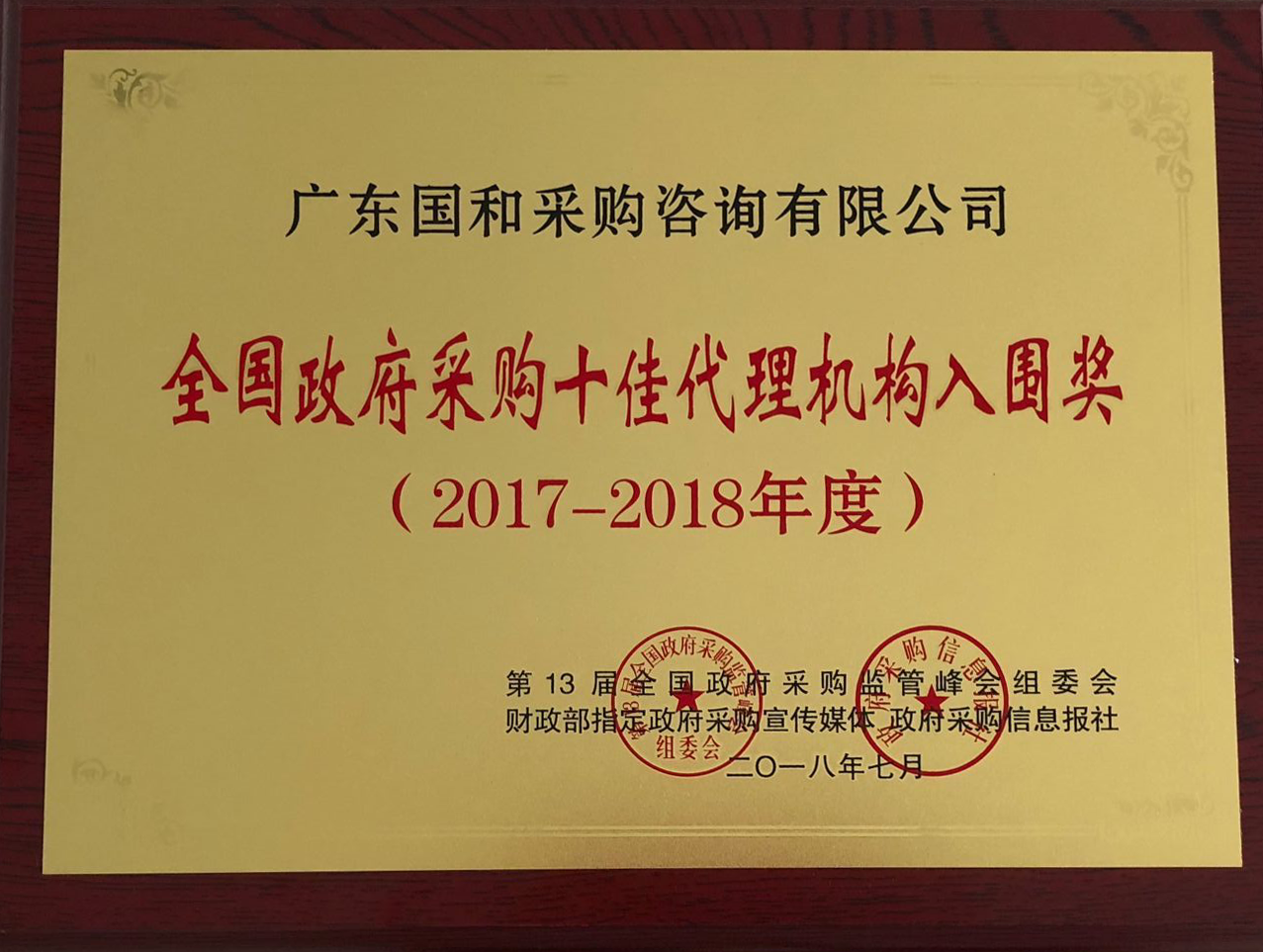 全國(guó)政府采購(gòu)十佳代理機(jī)構(gòu)入圍獎(jiǎng)(2017-2018年度)
