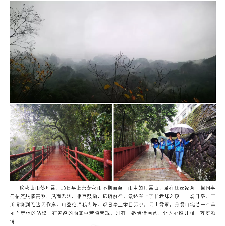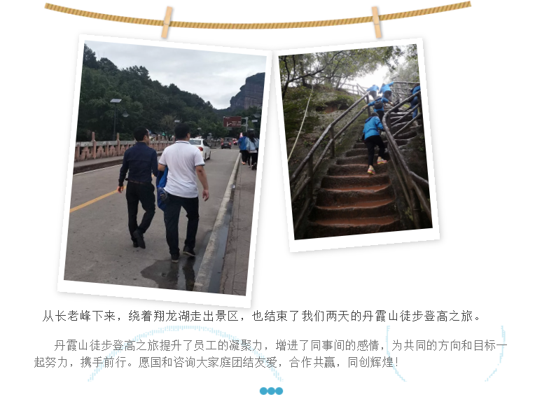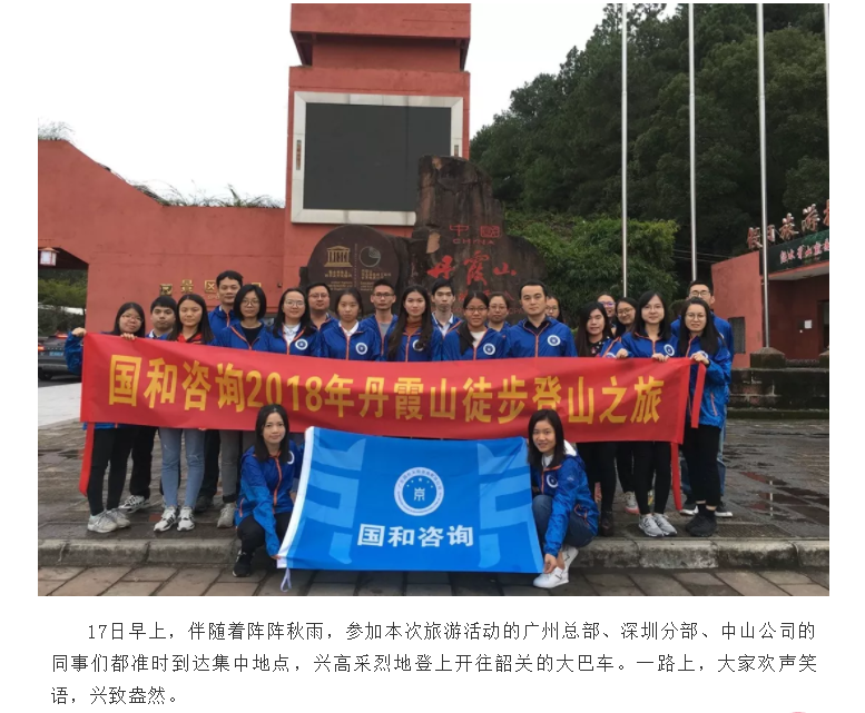 企業(yè)文化為了豐富員工的業(yè)余生活,緩解工作壓力,促進(jìn)員工之間的溝通與交流,提高團(tuán)隊(duì)協(xié)作和凝聚力,國(guó)和咨詢于11月17至18日組織開展了2018秋季丹霞山徒步登高旅游活動(dòng)。