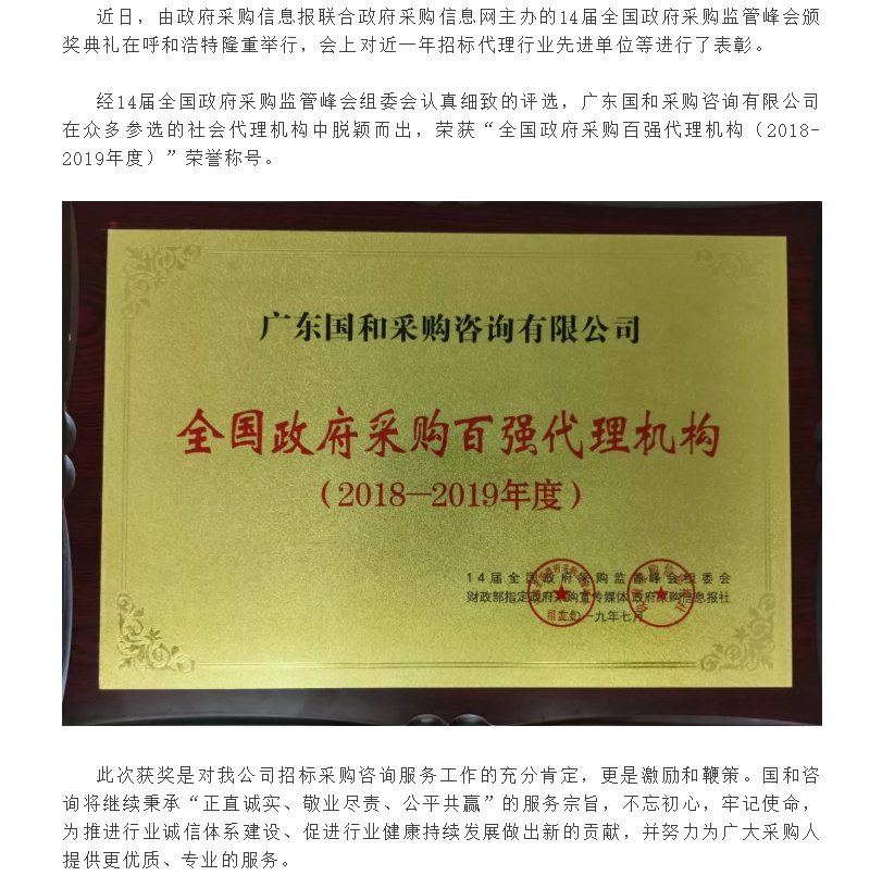 祝賀我公司榮獲“全國政府采購百強(qiáng)代理機(jī)構(gòu)(2018-2019年度)”榮譽(yù)稱號