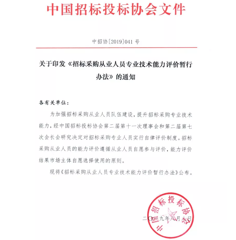 第十條 通過招采人員能力評(píng)價(jià)的人員,頒發(fā)中國(guó)招標(biāo)投標(biāo)協(xié)會(huì)用印的電子版《招采人員*級(jí)能力評(píng)價(jià)證書》(以下簡(jiǎn)稱《評(píng)價(jià)證書》)。獲得《評(píng)價(jià)證書》的人員,表明其已具備中國(guó)招標(biāo)投標(biāo)協(xié)會(huì)認(rèn)可的相應(yīng)級(jí)別的招標(biāo)采購(gòu)專業(yè)技術(shù)能力。